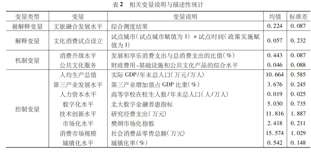 现有研究为本文控制变量的选取提供了充分理论依据。文旅融合发展受到宏观经济环境与多重要素禀赋的综合影响,主要体现在经济、教育和技术等方面。(1)经济层面。首先考虑地区经济发展水平、市场环境、消费能力对旅游发展的影响,选取人均国内生产总值、市场化指数、社会消费品零售总额作为代理变量。同时,城市的接待能力是旅游发展的基础保障,选用第三产业占比来反映城市服务接待水平。此外,大城市因规模效应更具旅游吸引力,因此选取城镇化率控制城市发展规模差异。(2)教育层面。一方面,随着教育水平和可支配收入的提高,居民对精神满足和文化内容的需求更大;另一方面,教育体系的完善与高等教育普及率的提高,有助于提升文旅领域的人力资源质量。因此,本文参照Yu等的研究,以人均高等学校在校生数量占总人口作为教育水平的代理变量。(3)技术层面。技术创新会影响文旅融合的管理效率和服务质量。技术手段的渗透使文化与旅游产品实现数字化转型,推动形成具有品牌影响力的产业集群。因此,选取研发经费支出和数字普惠金融发展指数作为代理变量。数字普惠金融发展指数由北京大学数字金融研究中心和蚂蚁金服集团共同编制,在相关研究中已被广泛认可。