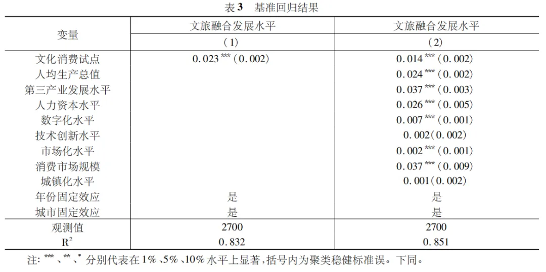 表3报告了相关的回归结果。其中,表3列(1)仅考虑双向固定效应的估计结果,表3列(2)是加入控制变量的估计结果。结果显示,在充分控制城市经济水平、产业基础、人力资本、技术水平和消费水平等相关变量的基础上,文旅融合发展水平在1%水平上仍显著为正,表明国家文化消费试点城市政策能够促进城市文旅融合发展水平。因此,假说1得到验证。