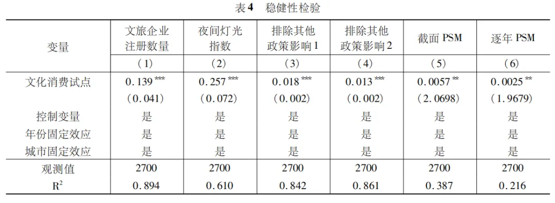 替换文旅融合发展水平指标。考虑到文化消费试点城市的主要目的是扩大有效供给、激发市场活力,文旅市场的创业活力、经济活力一定程度能够反映文旅融合发展水平。故本文尝试选用工商注册文化旅游企业数量、夜间灯光指数衡量文旅市场活跃度,以上两个指标能够反映城市文旅融合的供给数量与繁荣程度。回归结果如表4第(1)(2)列。由结果可知,更换核心解释变量也不影响实证结果,即文化消费试点设立的系数仍在1%的水平上显著为正,表明文化消费试点城市政策显著提升了区域的文旅融合发展水平。