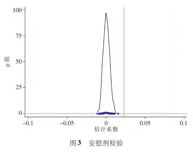 为了进一步排查非观察的城市因素特征对文化消费试点政策显著性的影响,借鉴已有的研究构造安慰剂检验。主要思路是:同时随机生成伪控制组虚拟变量和伪时间虚拟变量,即随机抽取样本城市与政策实施时间。具体而言,从270个样本城市中随机抽取43个城市作为虚假的控制组城市,且随机生成政策冲击时间,以上步骤将循环执行500次,以此得到500组的系数估计值及其对应的p值。结果如图3所示,对于文旅融合发展水平,随机处理过程中生成的结果分布在0周围,且p值基本分布于0.1的上方,回归的t值均位于真实回归系数的t值的左侧(t值为0.014),这说明对照组和处理组的时间趋势没有系统性差异。这表明文化消费试点政策的有效性并未明显受到随机因素的影响,该政策对文旅融合发展水平的作用仍较为稳健。