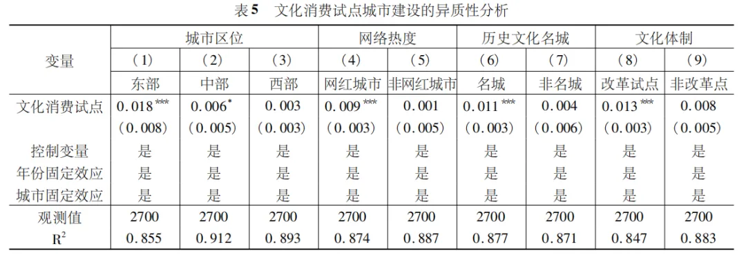 在数字经济与网络视频的催生下,网红城市一定程度能够促进旅游经济增长。本文依据2021年第二届《中国潮经济·2021网红城市百强榜》,构造网红城市、非网红城市两类虚拟变量,并生成其与文化消费试点的两重交互项,进而验证城市网络声誉的异质性。表5第(4)(5)列的回归结果显示,文化消费试点城市对网红城市的文旅融合发展具有显著正向促进作用,而对非网红城市文旅发展的促进不显著。在文化消费试点政策的积极推动下,网红城市凭借其在品牌效应、基础设施完善度、市场推广策略、创新能力、深刻的文化认同感以及强大的网络效应等多维度优势,有力地促进了文旅融合的深度发展。一方面,网红效应带动空间活力和价值升级的现象,反映了信息时代城市空间生产的新形式;另一方面,流量经济驱动旅游供给和需求要素的重新组合、集聚和扩散,快速地迎合了旅游者个性化需求。网红城市在文旅融合方面的成功实践,这与Panzera等的研究结论高度契合。该研究指出,单纯依赖物质形态的文化遗产禀赋已不足以在全球旅游市场中脱颖而出。相反,通过实施有效的资源推广、广泛的文化交流以及深入的价值化战略,才能将文化遗产转化为吸引国际游客的强大磁力。据此,网红城市需强化文化场景数字化、交互化与沉浸式体验供给,发挥其网络声誉与流量经济的放大效应。而对非网红城市则应着重于提升文化IP培育能力与数字传播基础设施建设,通过专业内容团队赋能地方文化表达,实现文旅融合政策从“流量引导”向“价值沉淀”的转型升级。