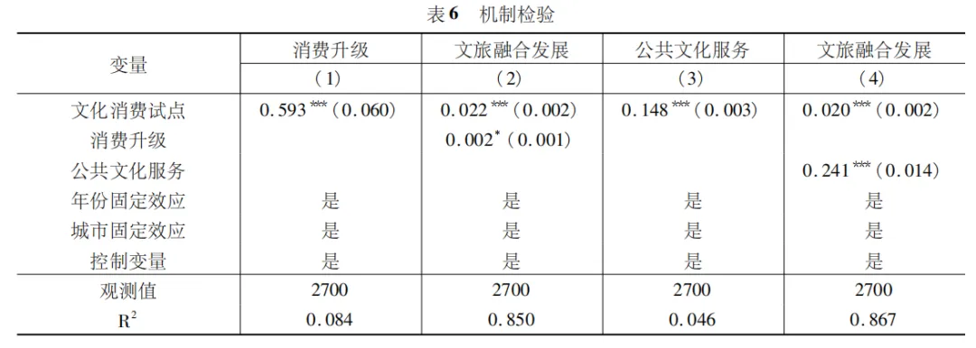 在探讨文化消费驱动文旅融合发展的作用机制时,本文设定式(6)所示的机制检验模型。其中,Mit为重点关注的各个机制变量,包括消费升级水平和公共文化服务水平变量。