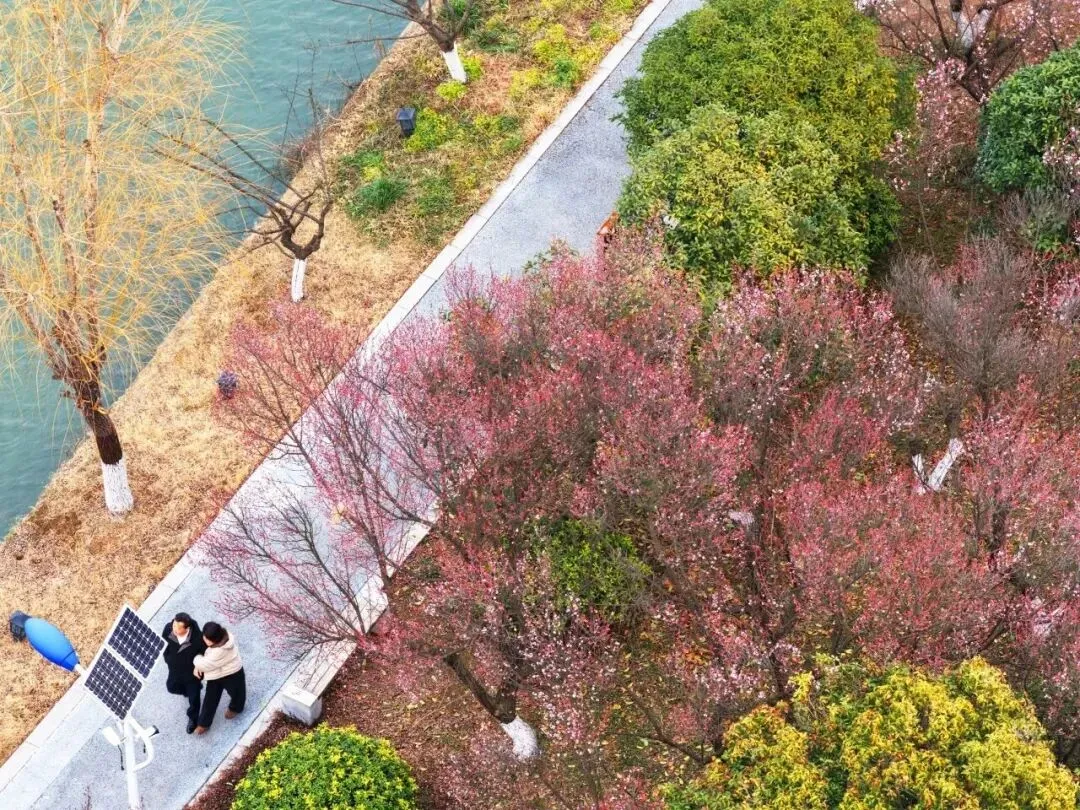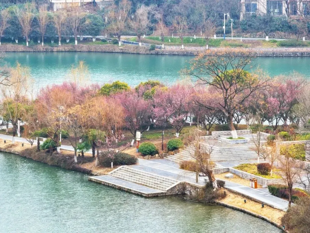 月梅花堤、万梅岭等景点的梅花粉色花盏缀满枝头,来到这里,清冽幽香萦绕鼻尖,翡翠湖面静卧眼前。