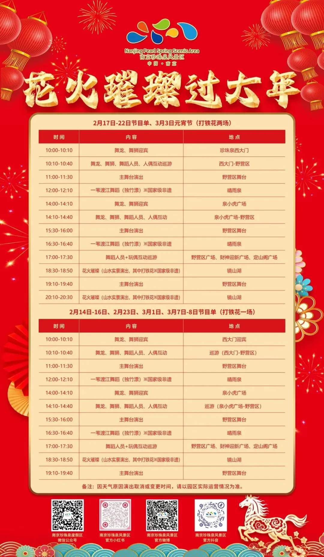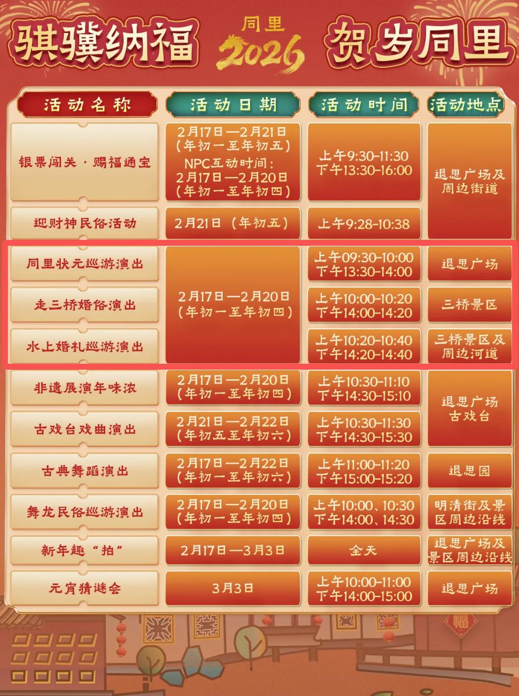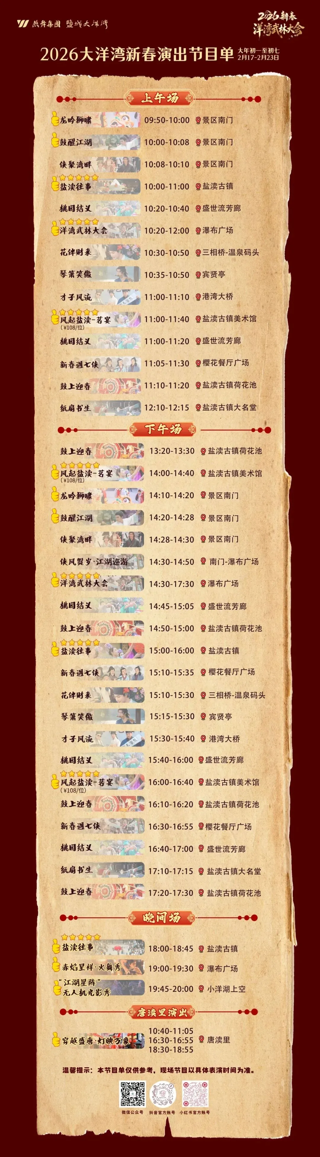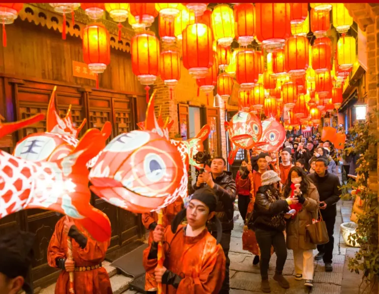 古戏台上非遗演出轮番登场,舞龙队伍穿行明清街巷,更多活动点击下图查看。