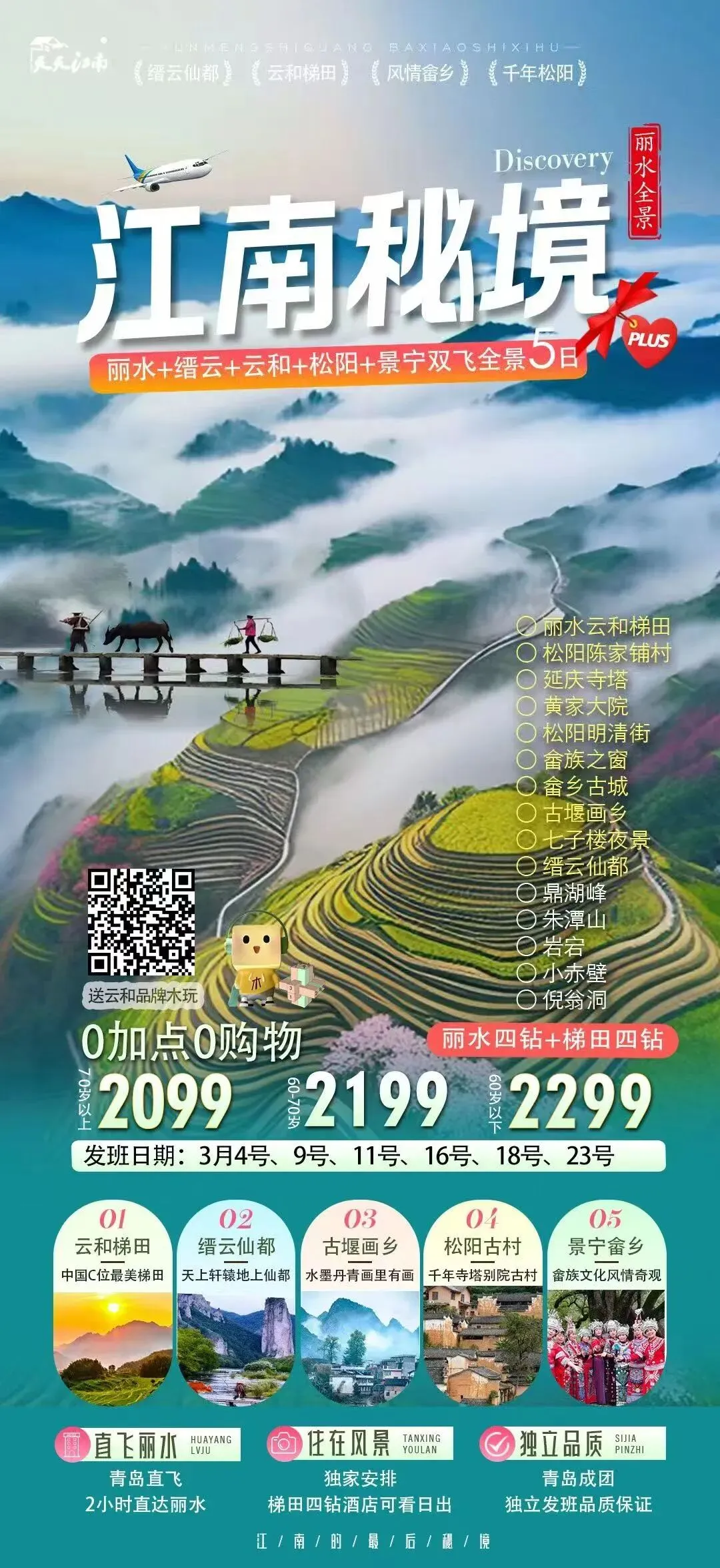 1、直飞:青岛直飞丽水,黄金时刻航班,无须早起晚归。