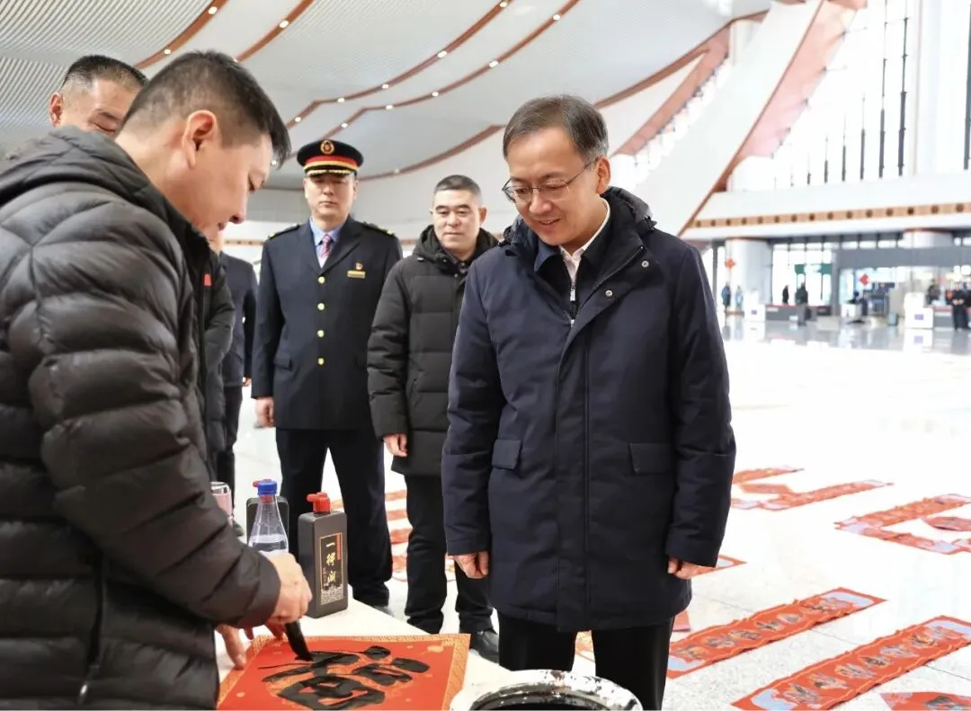 随后,向辉来到白山东站,调研候车大厅、安检通道、站台等重点区域客运保障情况。站内,市委宣传部组织开展的新春送祝福活动吸引众多旅客领取春联,向辉兴致勃勃地与书法爱好者交流,称赞他们用笔墨传递年味与温情。其间,他详细询问跨区域交通接驳、运力调配、客流疏导等措施,希望铁路部门与地方紧密协作,优化服务流程,强化安全管理,全力保障旅客出行安全、便捷、舒心。