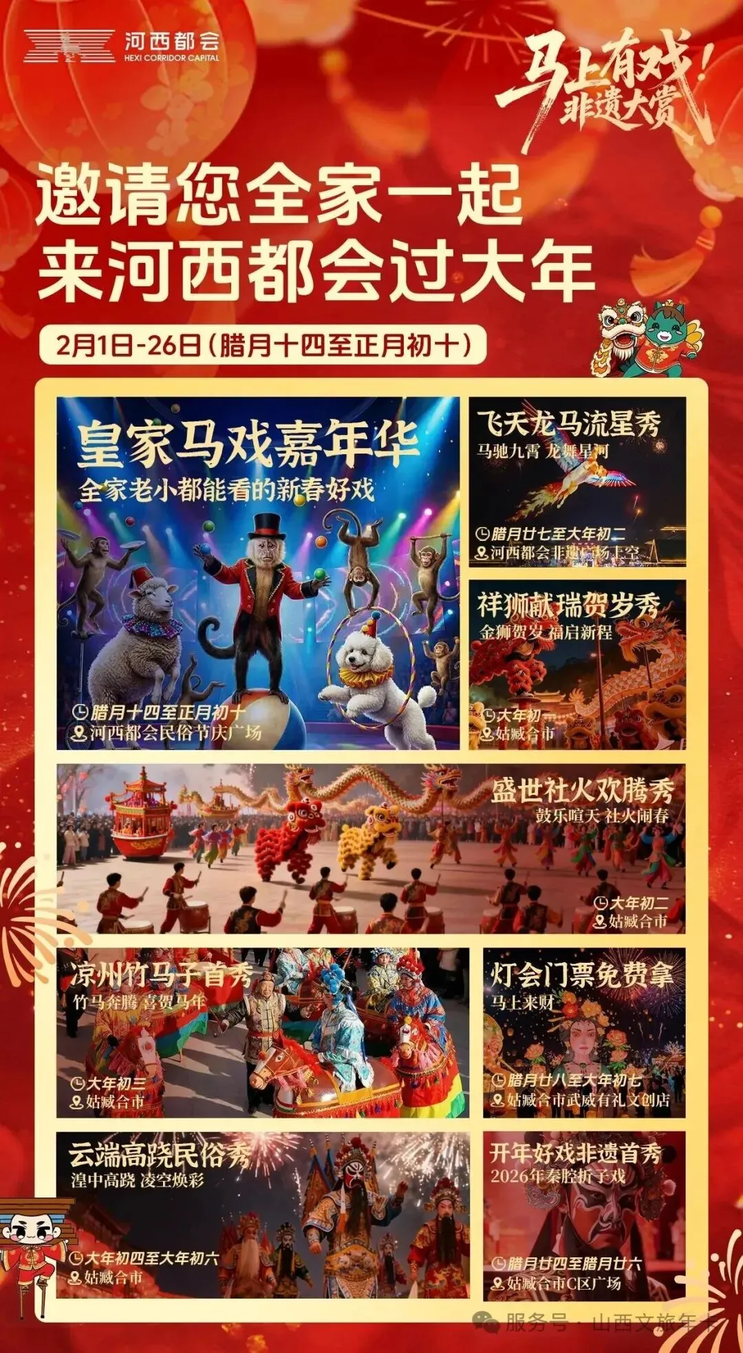 春节期间,景区每日有NPC巡游、国风快闪秀、非遗醒狮秀、丝路乐舞、川剧变脸等精彩演艺,还有天马篝火狂欢、非遗烟花木偶戏等互动活动,在璀璨灯海中,沉浸式感受盛唐凉州的繁华与年味。