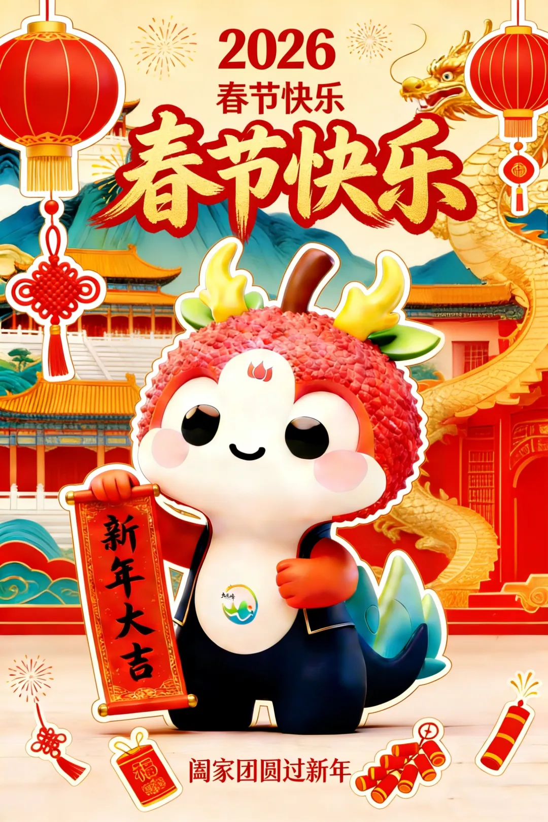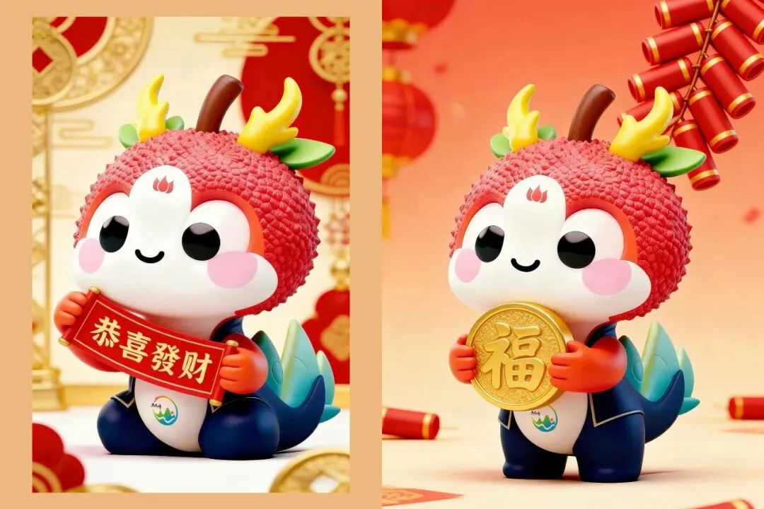 龙,源自“九龙峰”的古老传说,象征着祥瑞、好运;荔枝,是本地最甜美的风物名片,寓意富饶、丰收与待客之诚。当龙之灵气与荔枝的甜蜜结合,便化作了这个活泼可爱的龙宝宝。