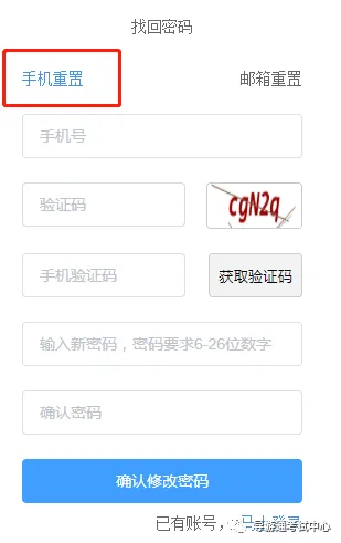 (1)【手机重置】使用报名时所用的手机号,发送手机验证码,即可修改新的密码。