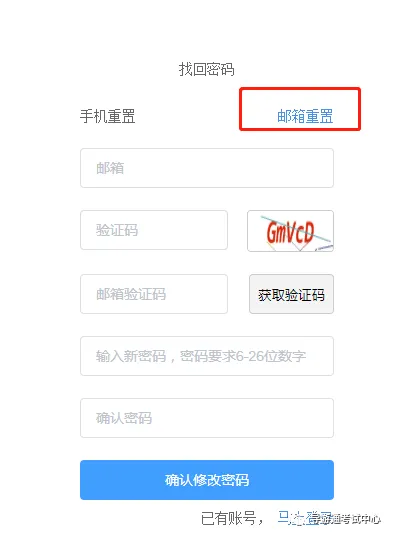 (2)【邮箱重置】使用报名时所用的邮箱,发送验证码,在邮箱中找到验证码并填写,即可修改密码。