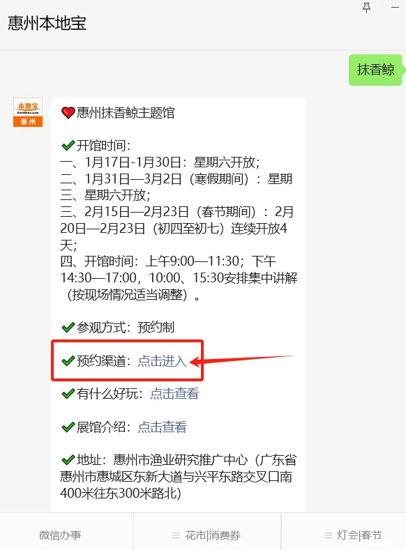➤在“惠州本地宝”公众号微信对话框: