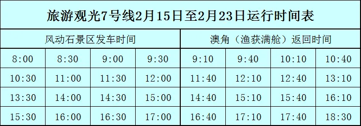 2026年春节假期(2月15日到2月23日)期间,为满足旅游乘客的出行需求,我司增加旅游7号线及3路 西埔-澳角(渔获满舱馆)的运行班次,终点站也由原来澳角小学门口改为澳角渔获满舱馆。