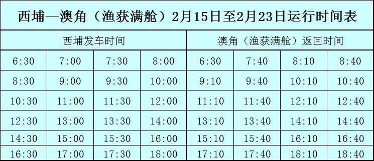 3路 西埔-澳角(渔获满舱)2月15日至2月23日运行时间如下: