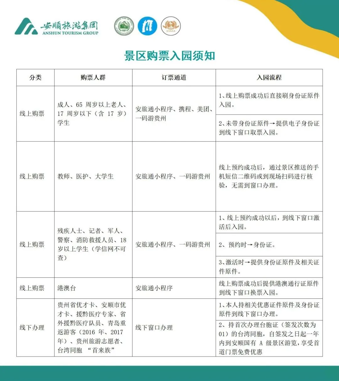完成景区门票预约后,请持本人身份证(购买特殊优惠票的还需携带特殊优惠相关证件到线下窗口激活)在预约时段内通过人脸实名比对入园。若未预约到黄果树、龙宫景区门票,请您合理安排行程,可选择前往天龙屯堡景区、格凸河景区、高荡景区等周边其他景区游览。为了方便您及时掌握动态信息,敬请关注安顺旅游集团及旗下各景区官方账号。