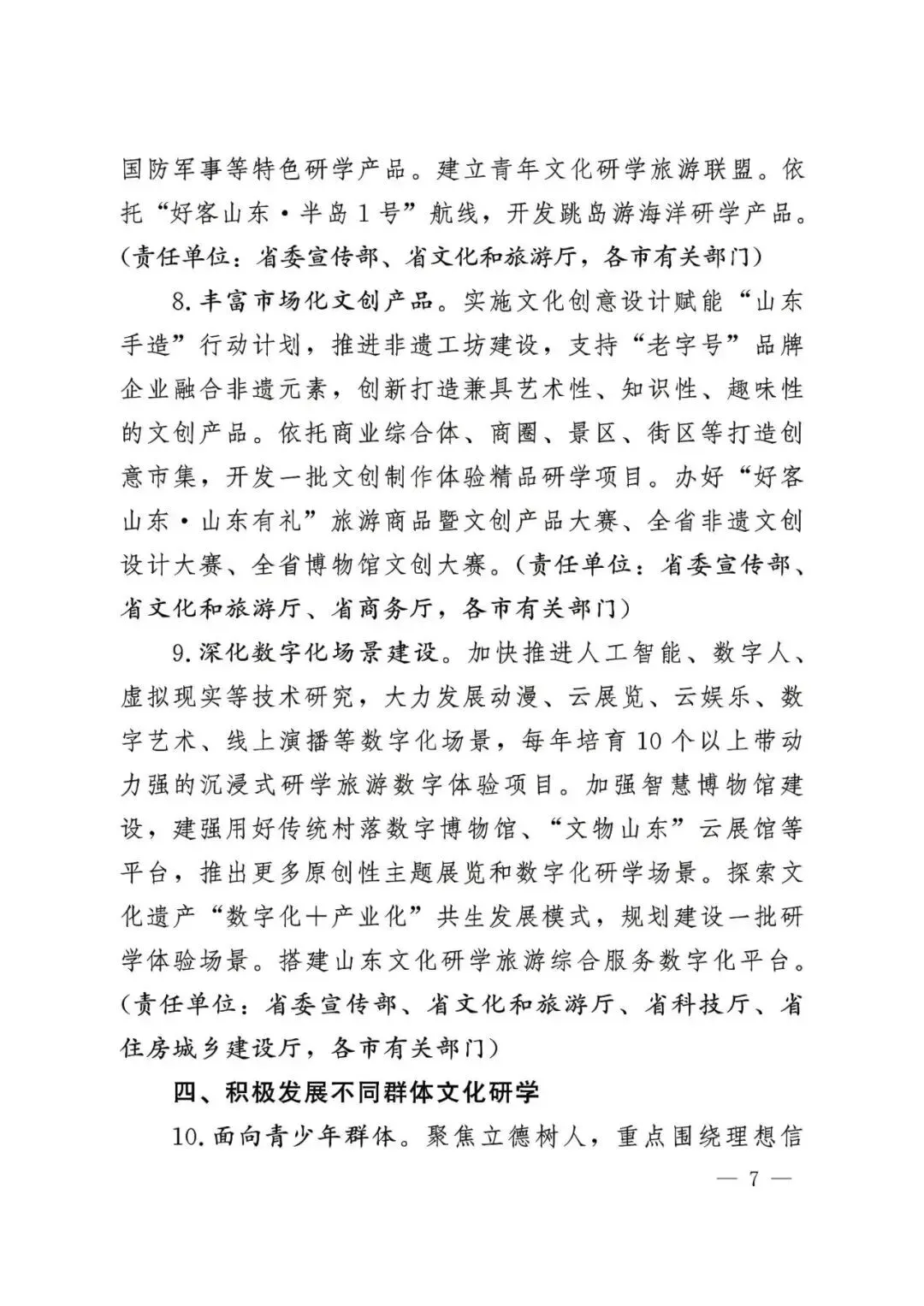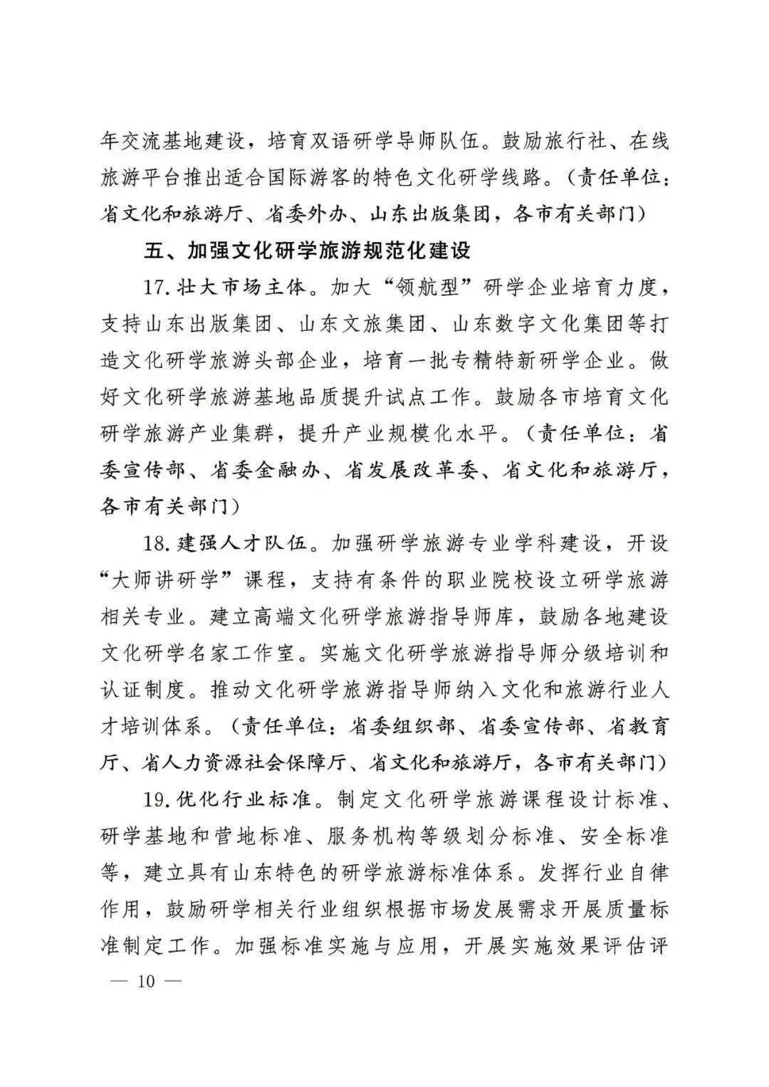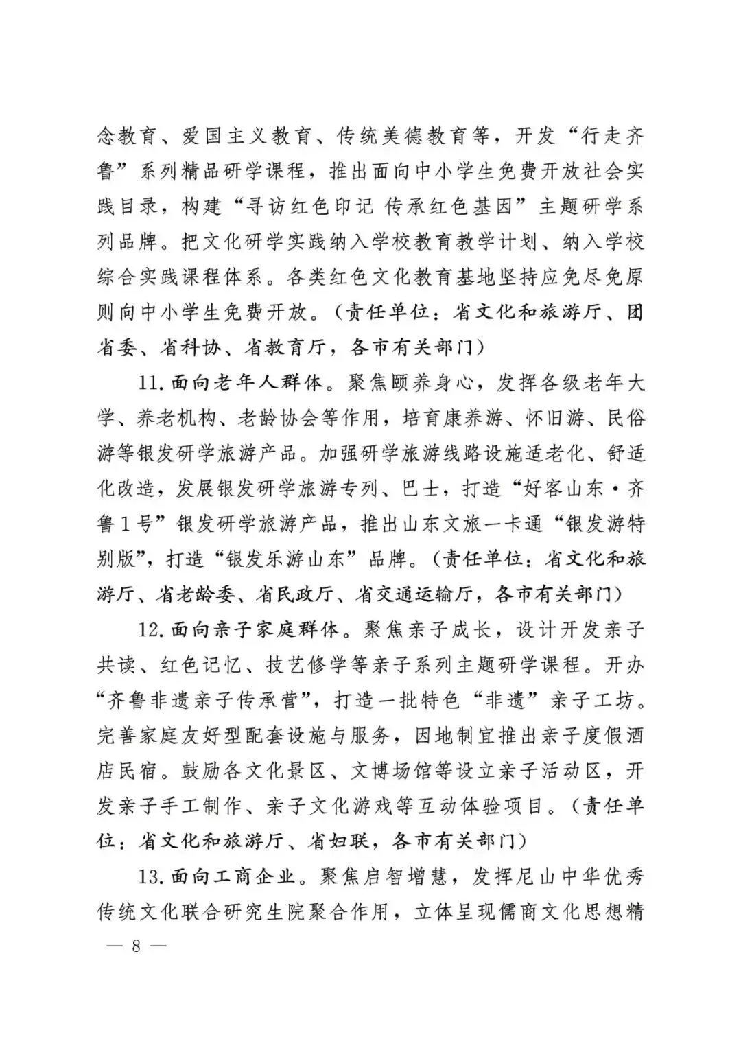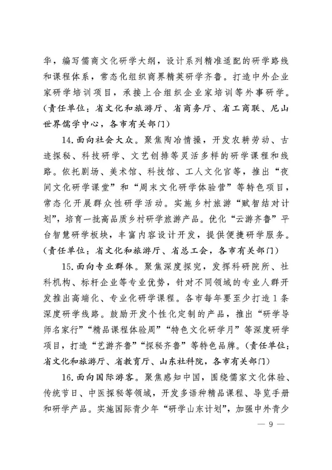 面向国际游客。聚焦感知中国,围绕儒家文化体验、传统节日、中医探秘等领域,开发多语种精品课程、导览手册和研学产品。实施国际青少年“研学山东计划”,加强中外青少年交流基地建设,培育双语研学导师队伍。鼓励旅行社、在线旅游平台推出适合国际游客的特色文化研学线路。