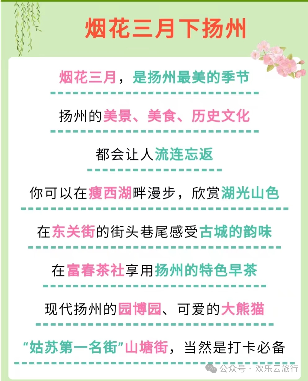 游玩【扬州园博园】、观看大熊猫。博览园选址于扬州仪征枣林湾核心区,生态环境良好,景观资源丰富,有“三山、五湖、两河、一泉”等自然资源。园博会旨在打造郊野公园、地景博览园,体现江苏大地景观特色