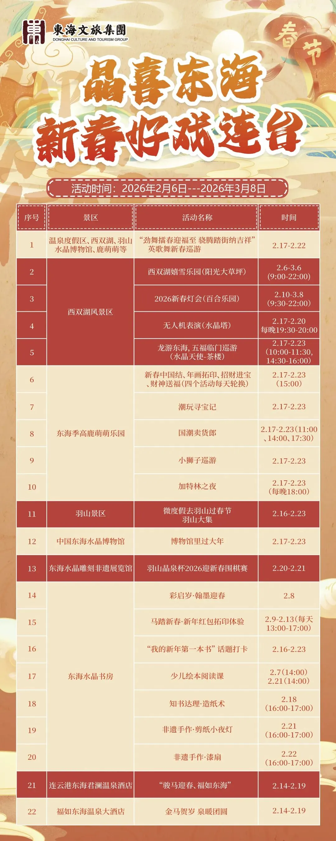 车管所临时停车场至景区开通免费游客公交:2026年2月17日至2月21日,景区将根据实际情况开通免费游客公交,免费接送游客往返临时停车场至景区。