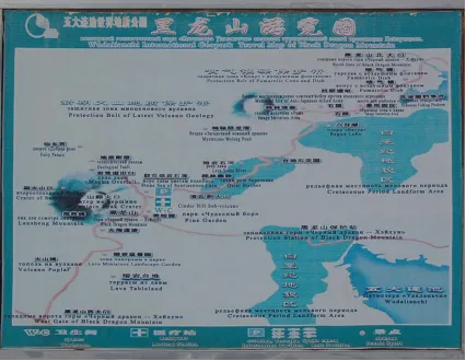 看了浏览图就清楚了,我乘出租车是从东北方向到老黑山的,经过桦林沸泉、台地石花园、翻花熔岩石海、岩浆溢出口到达山巅火口,并到揽胜峰转悠一圈,然后在另一条路下山。五大连池在老黑山的东偏南方向。