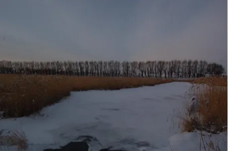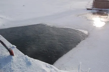 汽车下山了,这次是穿五大连池而过了,但也是白色一片。过一条小桥,司机说,快看,这儿的水在流淌。就叫他停下车来,一看桥的两侧果然是冒着热气的清流。冒着热气并不表明水有多热,但比气温起码高出30℃。这在以前的萝北金满屯也见到过,不过那儿的水是流到地上,不久就冻上了,而这儿的还是流入湖中,流入冰底。