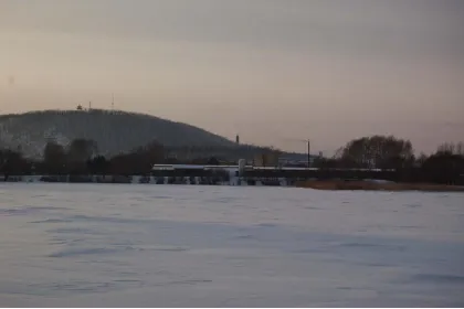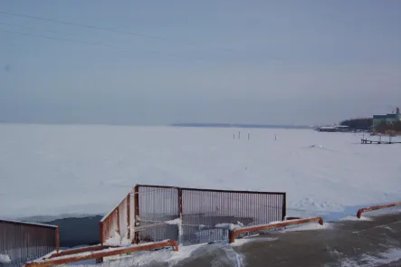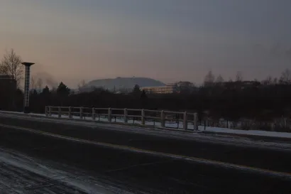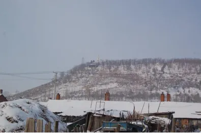 照片中广袤的一片就是五大连池。冬天只是白色一片。从这幅图可以看清,铁栏沾上水马上结成了冰。