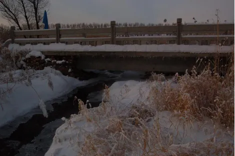 追着流水到了桥前,水从桥下流过,要拍必须躺在雪地上拍。就躺着拍了这张照片。这撒不得谎,不是躺着拍不出桥下的水流。