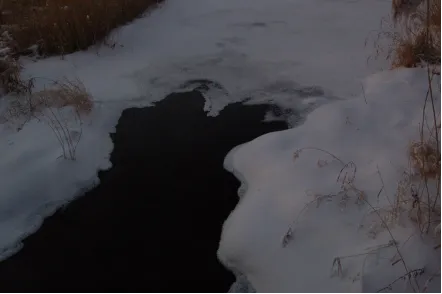这儿很开阔,可以看出,流水边的冰有些融化,但又冻起来了。