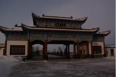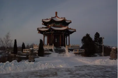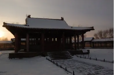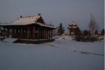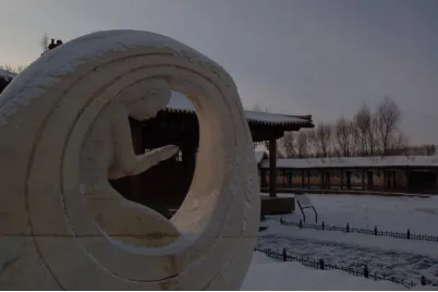 看到一两座古色古香的建筑,就走了过去。看到了雪原中竖着一块石碑,上面写着药泉湖几个大字,想想泉眼应该就在附近了。照了相,再往前走果然看到了汩汩流淌的泉水,就拍了好几张照片,有几张还是躺在雪地上拍摄的。这下才了却心愿。