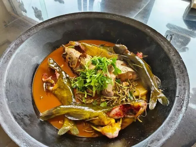 镜泊湖鱼锅讲究大铁锅,红鱼、江鲤、江鳟一锅炖,汤清不腥。
