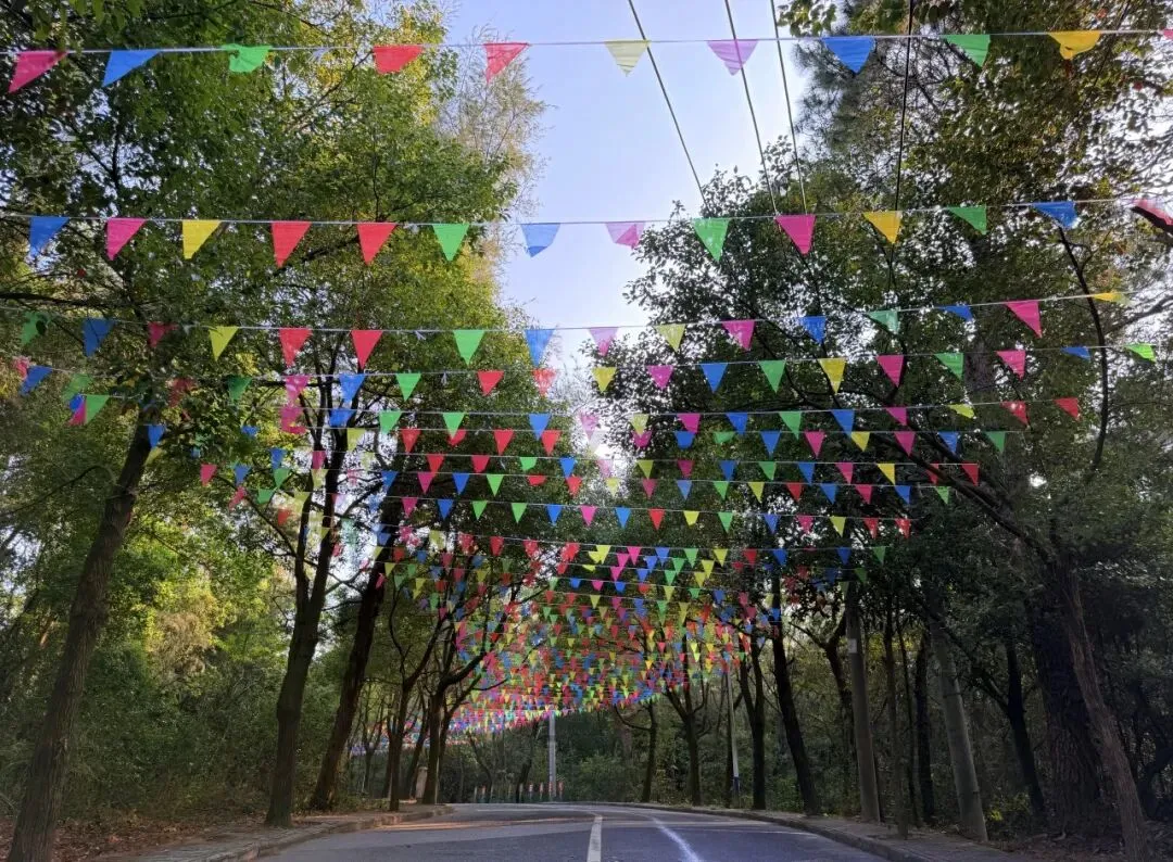 彩旗飘扬,活力四射:道路两侧彩旗飘扬,不仅增添了节日气氛,也起到了引导游览的作用,五彩旗帜象征着新一年的缤纷生活,传递着景区对每一位游客的新年美好祝愿。