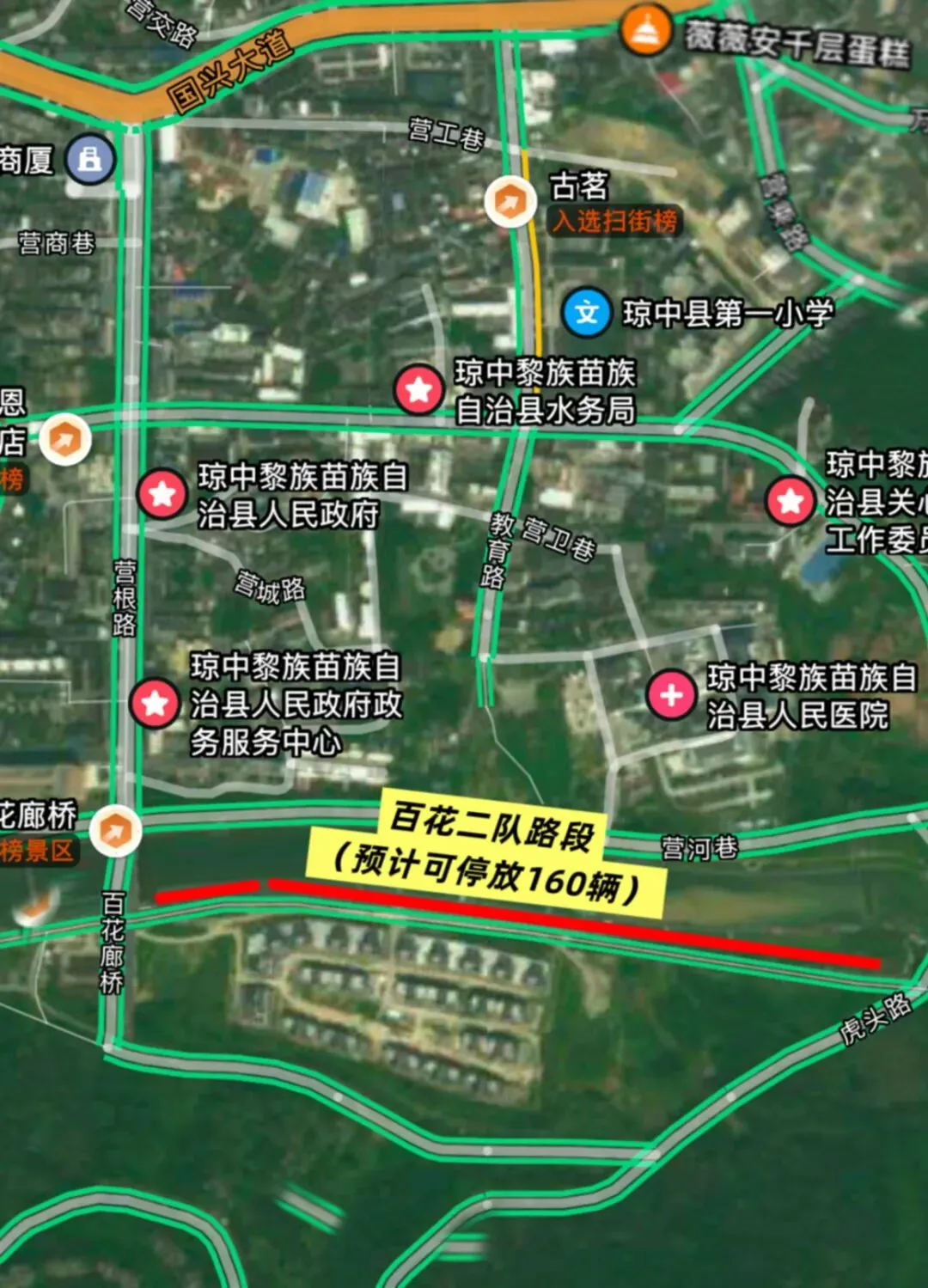 【1】百花岭景区门口至百花大桥路段,全长约5公里,转弯处禁止停放车辆,单边停车预计可停放650辆。
