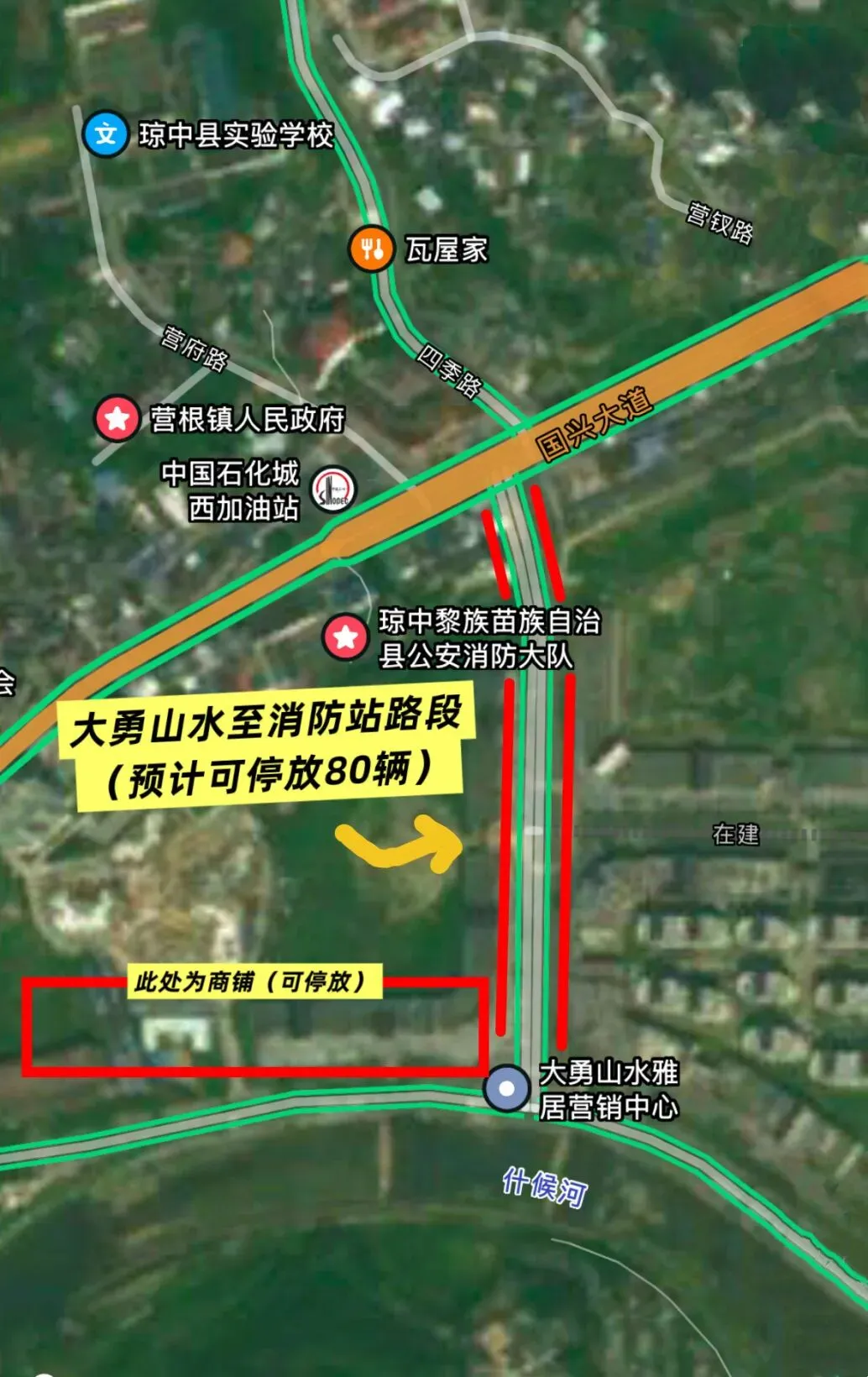 【7】大勇山水至消防站路段长约180米,两边可停放车辆50辆,大勇山水商铺停车场可停放30辆,该路段预计可停放车辆总量为80辆。