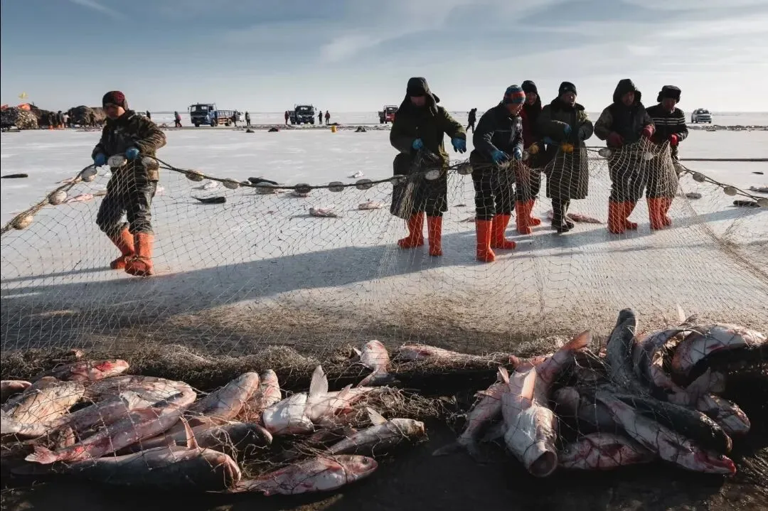 渔把头马文岩一声喊,渔网从磨盘大的洞口拖出,上万条大鱼水花四溅砸上冰面 。