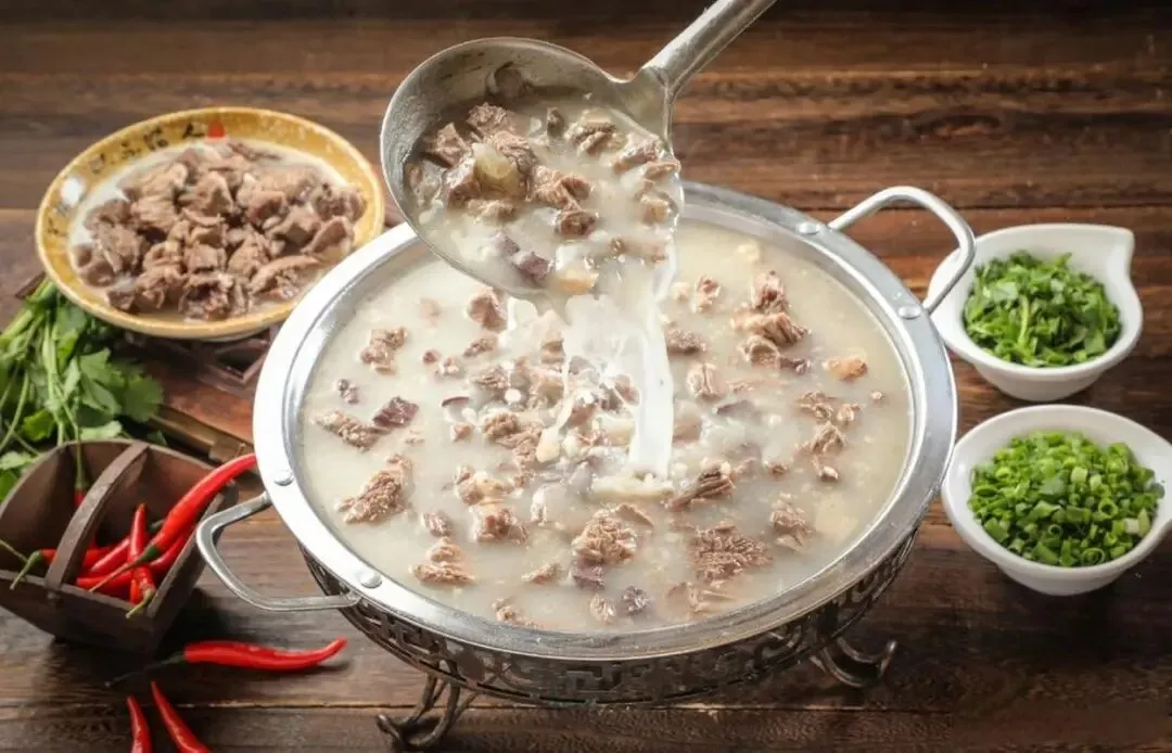 小市羊汤来一碗,肉片薄,汤奶白。