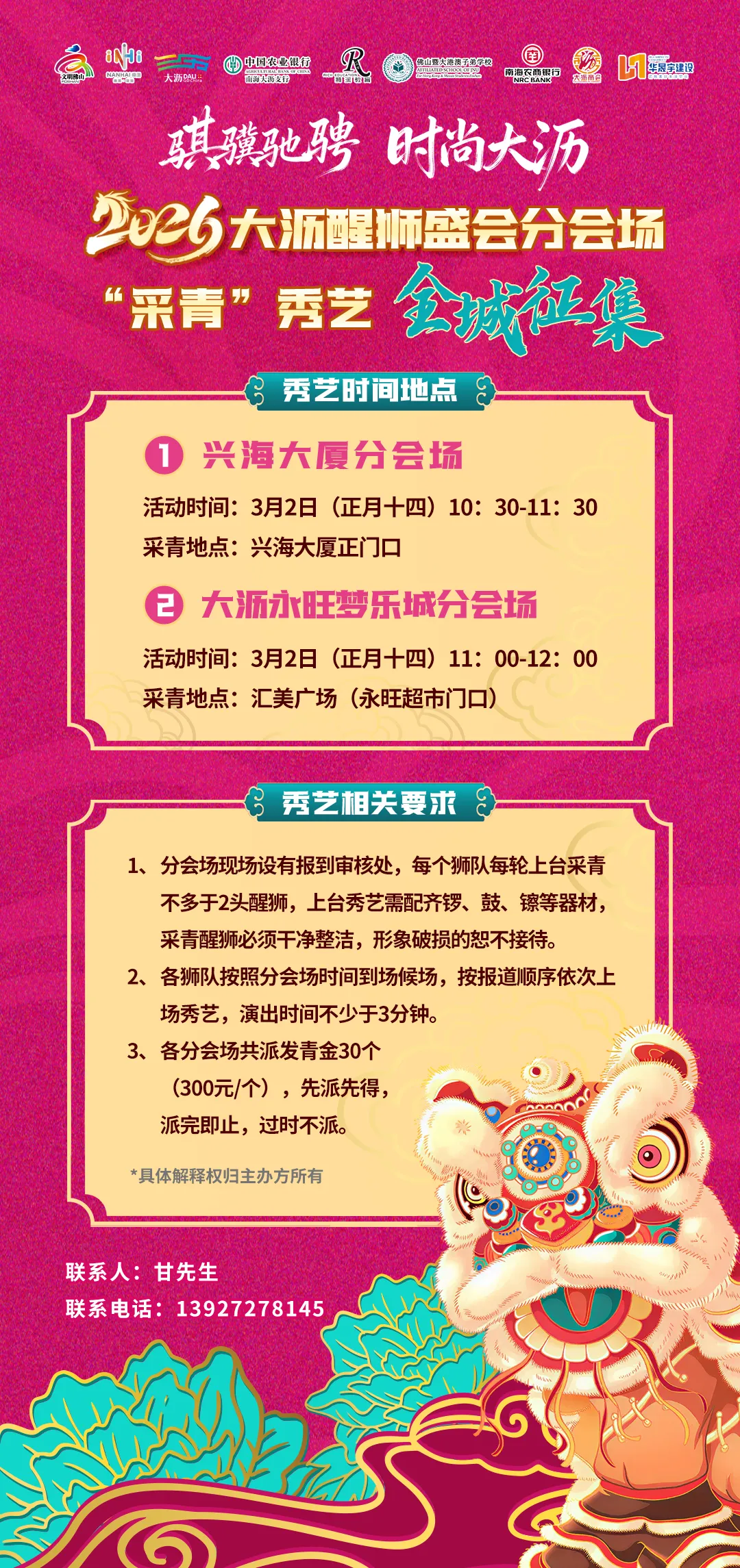 活动时间:3月4日(正月十六),泌冲邻里嘉年华10:00-14:00,黄飞鸿醒狮表演13:00-16:30