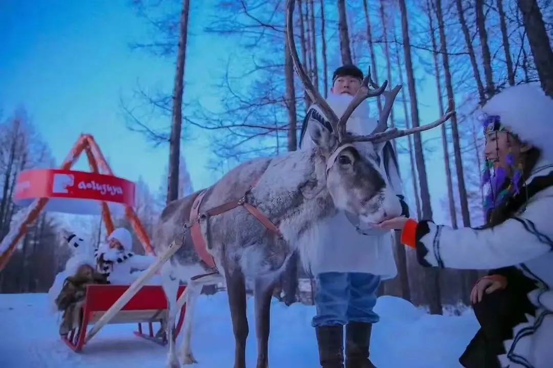 6、使鹿文化秘境区:驯鹿迁徙表演、鄂温克民俗演艺、投喂苔藓、雪橇爬犁