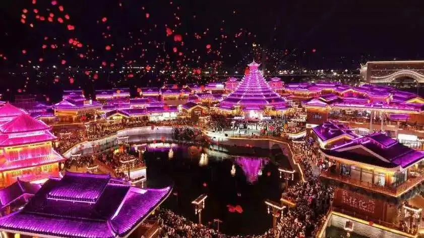 20:00-20:35 【加长版灯光秀】含春节水幕电影、鹤鸣福地主题水幕电影,还有打铁花、互动祈福(手机写祝福,能实时投射到屏幕上),最后会发放终极消费券!