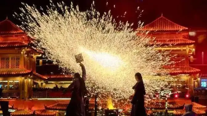 嘉年华重头戏表演,每日19:30固定上演,专业团队打造铁花飞溅如星雨的绝美视觉盛宴,安全区独立封控,放心欣赏璀璨铁花夜景。