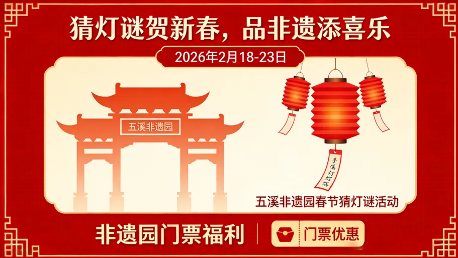 五溪非遗园春节猜灯谜活动,通过趣味猜灯谜互动,搭配非遗园门票福利,营造节日氛围,推广非遗文化,提升非遗园知名度与美誉度。
