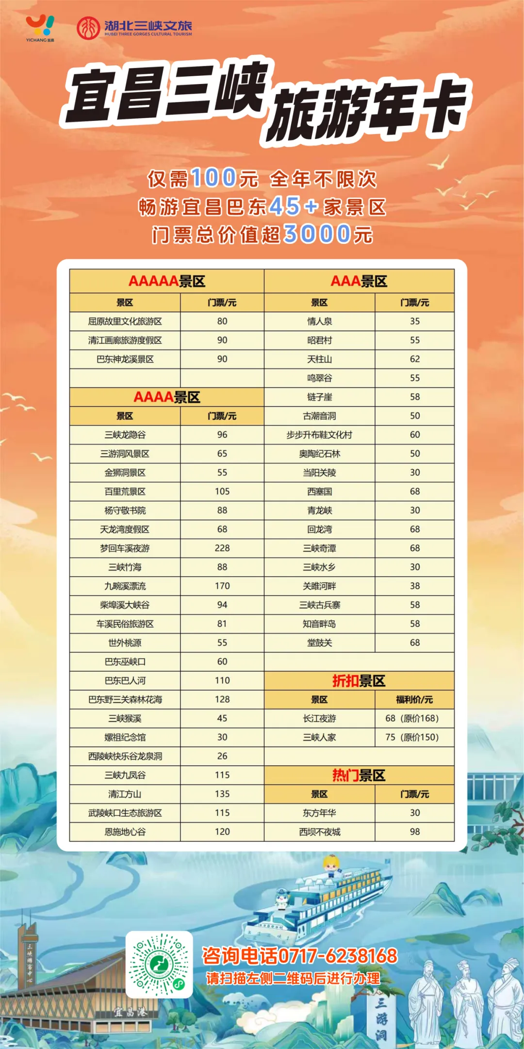 走进如诗如画的三峡秘境,看吊脚楼、赏土家歌舞,感受原生态巴楚文化。新春推出 **“山神赐福季”**,园区设多个主题祈福点,搭配特色民俗表演,赏山水的同时收获新春美好祝愿,年卡用户免大门票。 宜昌旅游年卡堪称 “性价比之王”,仅需 100 元,即可实现全年不限次畅游 45 + 家景区,覆盖 5A、4A、3A 各等级景区,包含屈原故里文化旅游区、清江画廊、巴东神农溪等知名景区,单景区门票总价超 3000 元,春节期间除部分夜场、二次消费项目外,持卡可畅玩核心景区。 此外,年卡还覆盖多家折扣景区,长江夜游 68 元(原价 168 元)、三峡人家 75 元(原价 150 元),新春出游叠加优惠,性价比拉满!年卡官方咨询电话:0717-6238168(可咨询办卡、用卡、景区开放等所有相关问题) 年卡面向宜荆荆恩地区户籍居民及在该区域工作、学习、居住的外地人员发行,支持线上、线下双渠道办理,电子卡办理后立即生效: :微信关注「宜昌旅游景区年卡」公众号→点击「年卡办理」→按提示上传身份证 / 居住证明等资料→缴费 100 元,即可生成电子年卡; :可前往宜昌礼物(博物馆 2/3 楼、三峡游客中心等 6 家门店)、满意楼 Gift(二马路历史文化街区)现场办理。