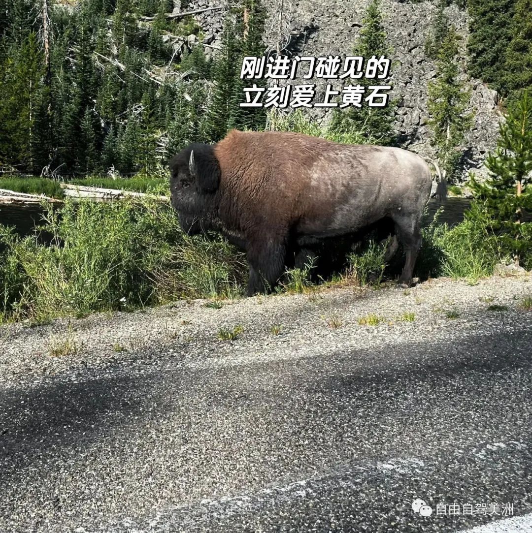 车流慢下来可能就是有动物了,注意左右看看。树林里比较容易看到鹿。野牛一般在路上