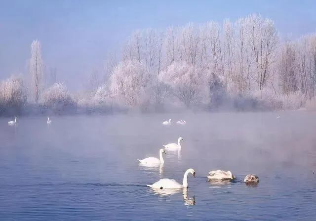 夏天的伊犁是草原天花板没错 , 可冬天也绝了。 森林盖着雪 , 木屋安安静静 , 天鹅泉那边 , 银色雾凇配上白天鹅 , 雾气朦朦胧胧的 , 怎么说 , 就像误入了仙境。