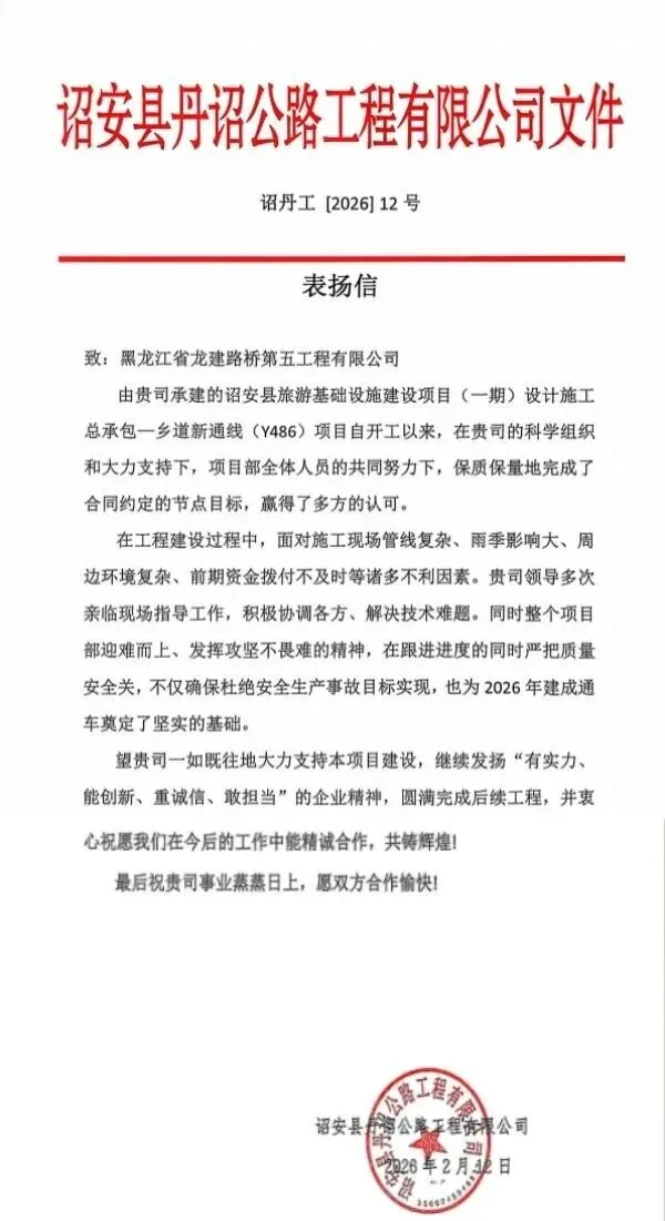 深学细悟职代会精神,凝心聚力谋发展新篇。春节即将来临之际,第五项目部以公司职代会精神为引领,坚守阵地,攻坚不松劲,近日完成了诏安县旅游基础设施建设项目(一期)新通线下面层施工,收到业主诏安县丹诏公路工程有限公司发来的表扬信,高度认可项目部保质保量完成合同既定节点目标。