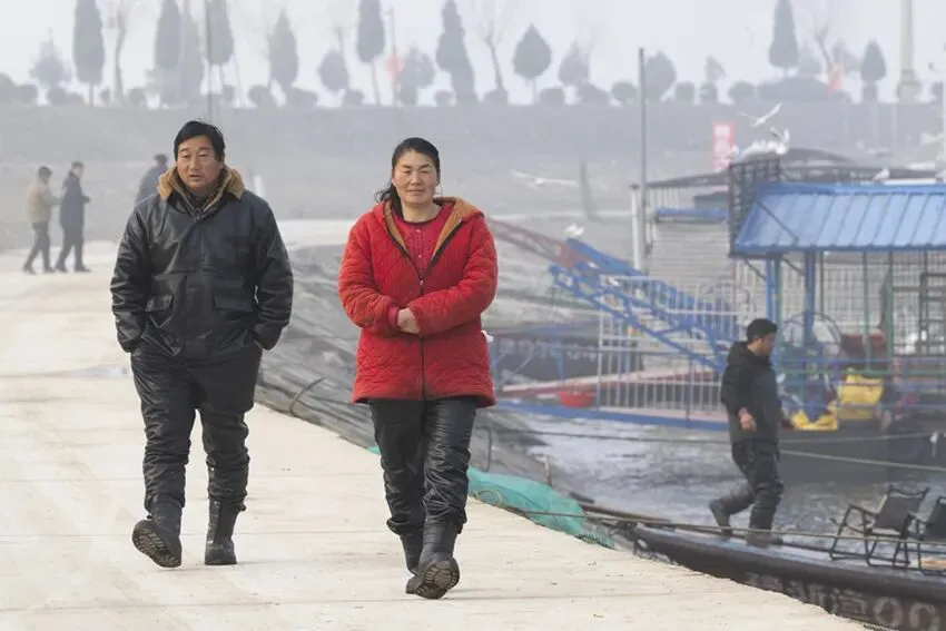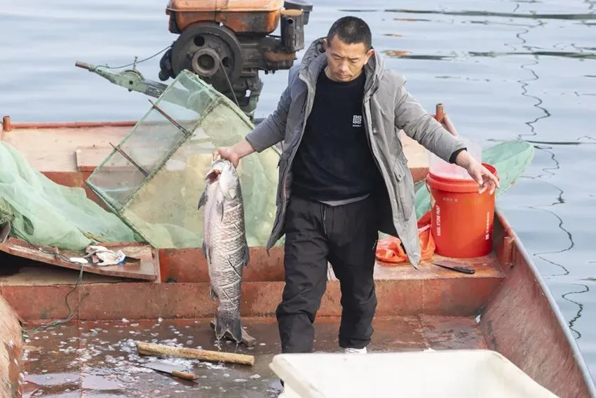 清晨,两位渔民穿着兼具保暖与防水功能的皮衣、棉服,正沿着水泥码头步道沉稳前行。一汪清水,一条渔船,是丹江岸边人们的生计所依。