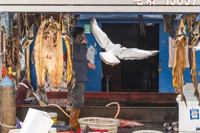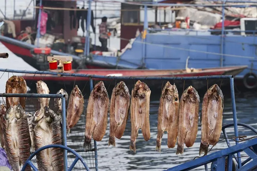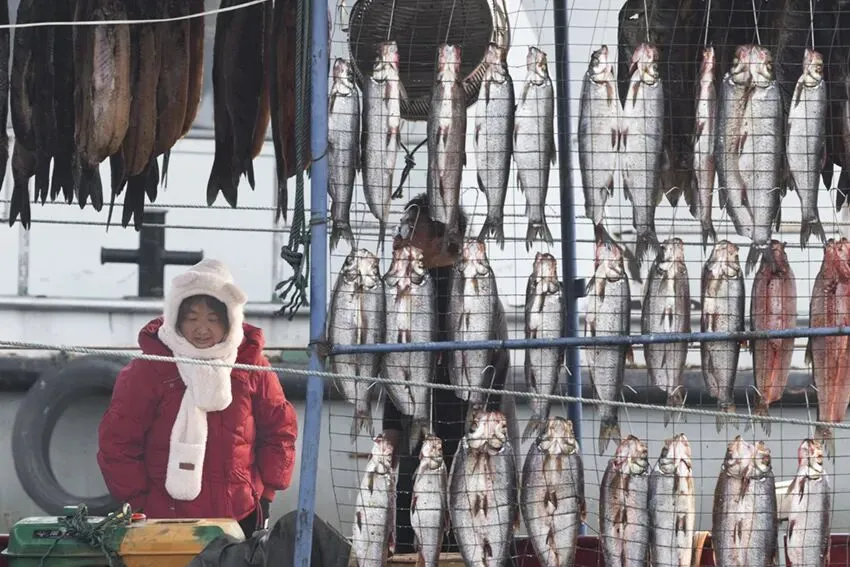 船民把捕捞的鲜鱼宰剥、腌制,做成风干鱼。