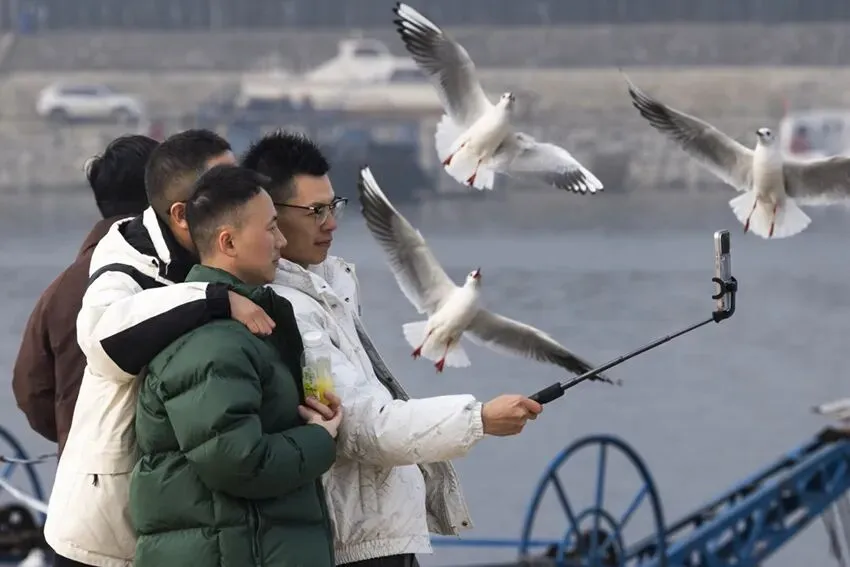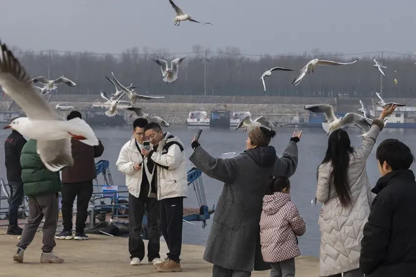海鸥云集,宋岗码头出现了“观鸟潮”,很多游客站在江边与海鸥合影留念。