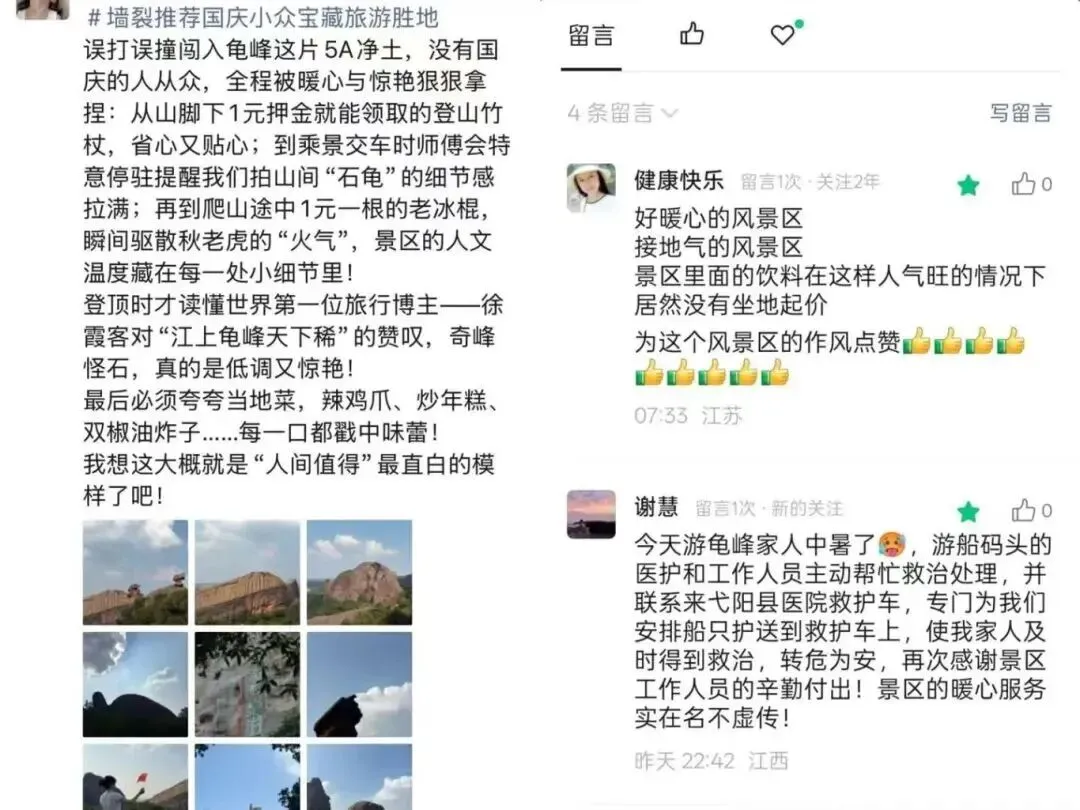 以龟峰为例,“为服务而来”表现得尤为明显。在某OTA平台上,“服务贴心”“细节到位”“消费放心”等在龟峰评论区被频繁提及,不少游客表示“还会再来,就冲这份贴心服务”。