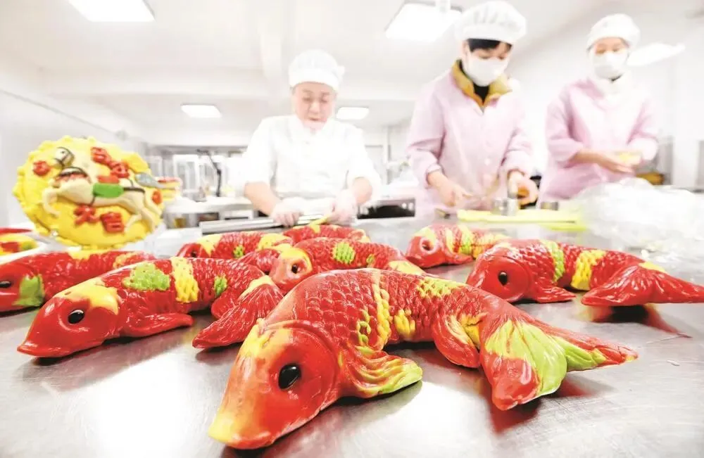 ◎在我市,制作花馍寄托着人们对新年的美好期盼,寓意新的一年日子甜甜蜜蜜、生活蒸蒸日上。图为二月十二日,峰峰矿区一家花馍工作室的工作人员在制作花馍, 供应节日市场。