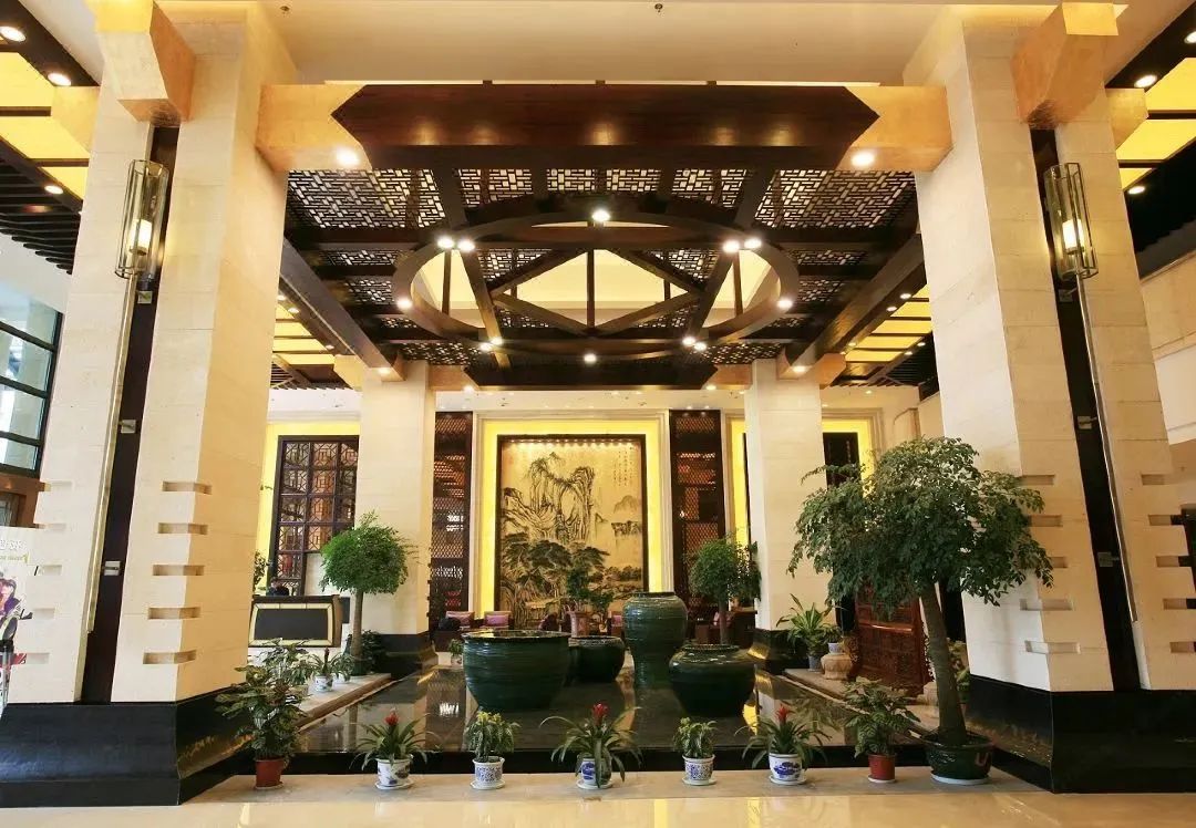 饭店大堂巧妙的景观设计,从整体来看外围的四根大柱子代表方正,上方圆形的吊顶设计代表天圆,俗话说没有规矩不成方圆,采用了当地最好的砚石作为池底,上面雕刻了葵龙,在巨大的石雕作品上不规则放置了五口缸,象征着“五谷丰登、风调雨顺”,缸里的水循环不断地从缸沿缓缓溢出,“满溢满溢”也寓意我们的服务让每位宾朋“满意”。