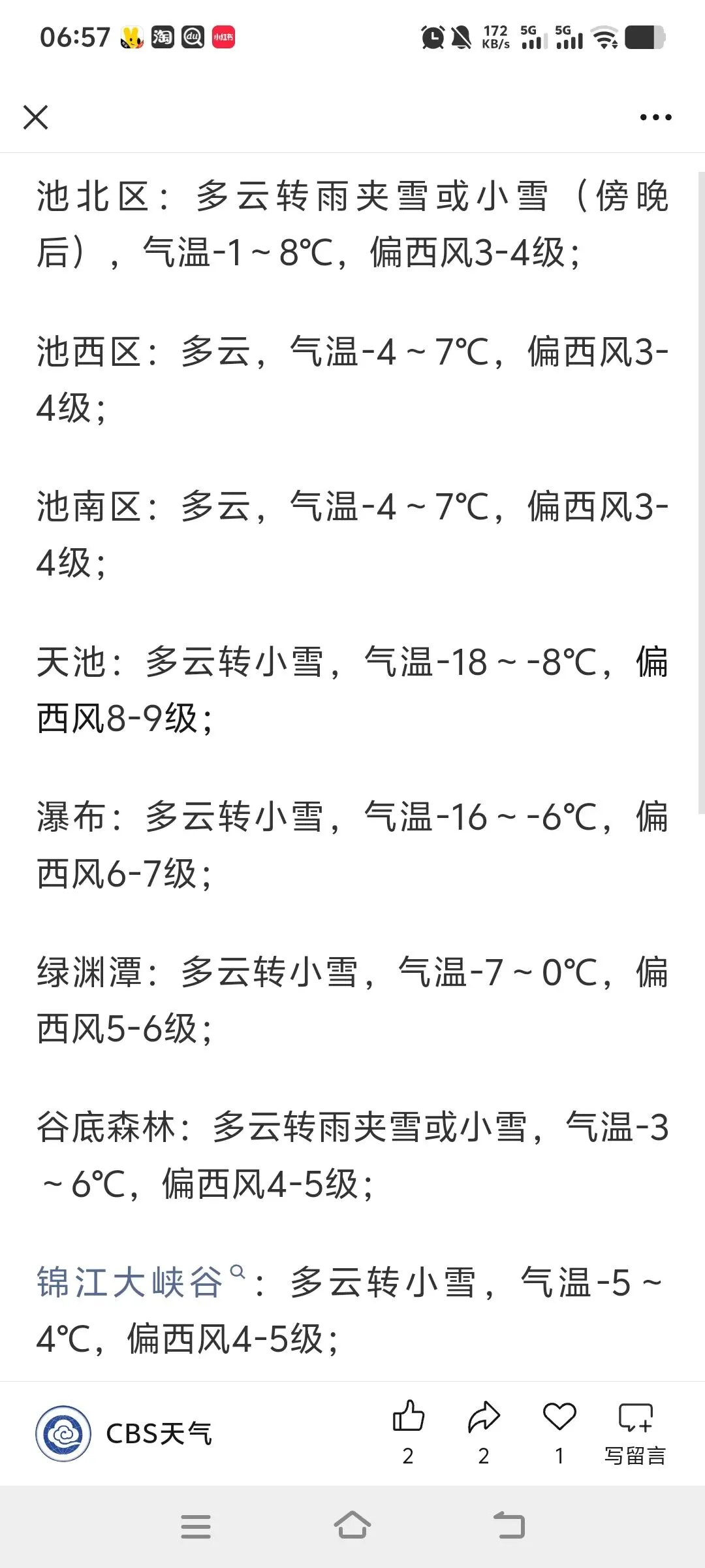 ➡️北景区天池主峰,风力较大,公路、栈道积雪,不具备安全运营条件,天池景点全天关闭。其他景点正常开放,视天气情况随时关闭。 ➡️西景区主峰,风力较大,公路积雪结冰,不具备安全运营条件,天池景点全天关闭。粉雪谷、锦江大峡谷景点,正常开放,视天气情况随时关闭。 ➡️南景区关闭。