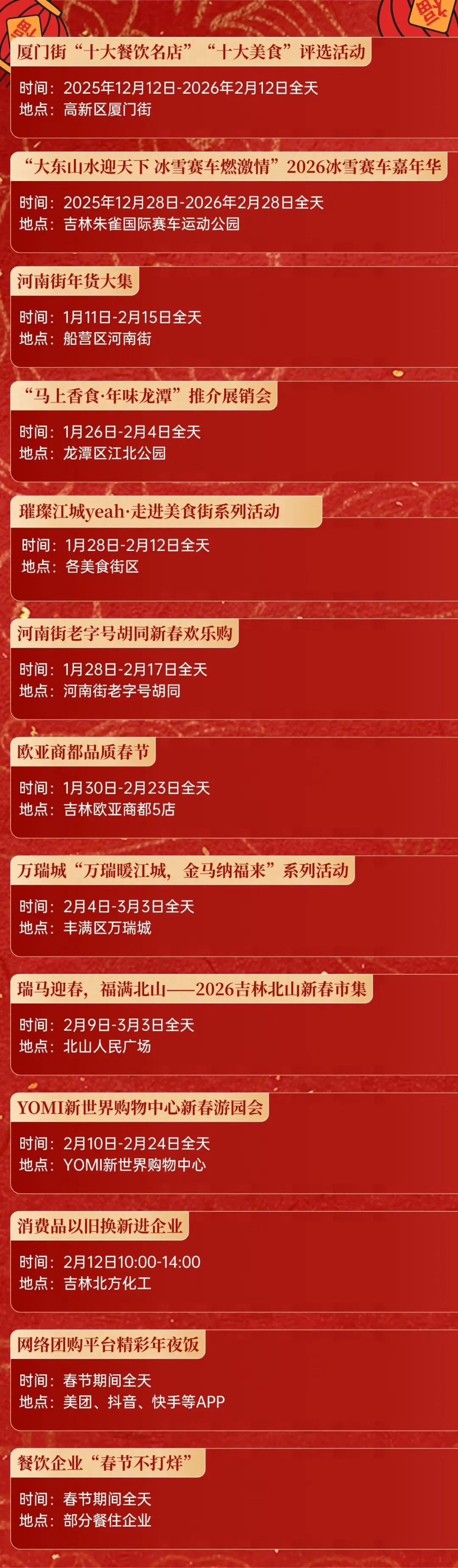 2026新春佳节如期而至,春节期间,吉林市将以“大东山水迎天下·吉林乌拉过大年”为主题,推出丰富多彩的春节系列活动,提供“吃住行游购娱”全方位服务保障,让本地市民与来吉游客共度一个喜庆祥和、欢乐浪漫的马年春节。